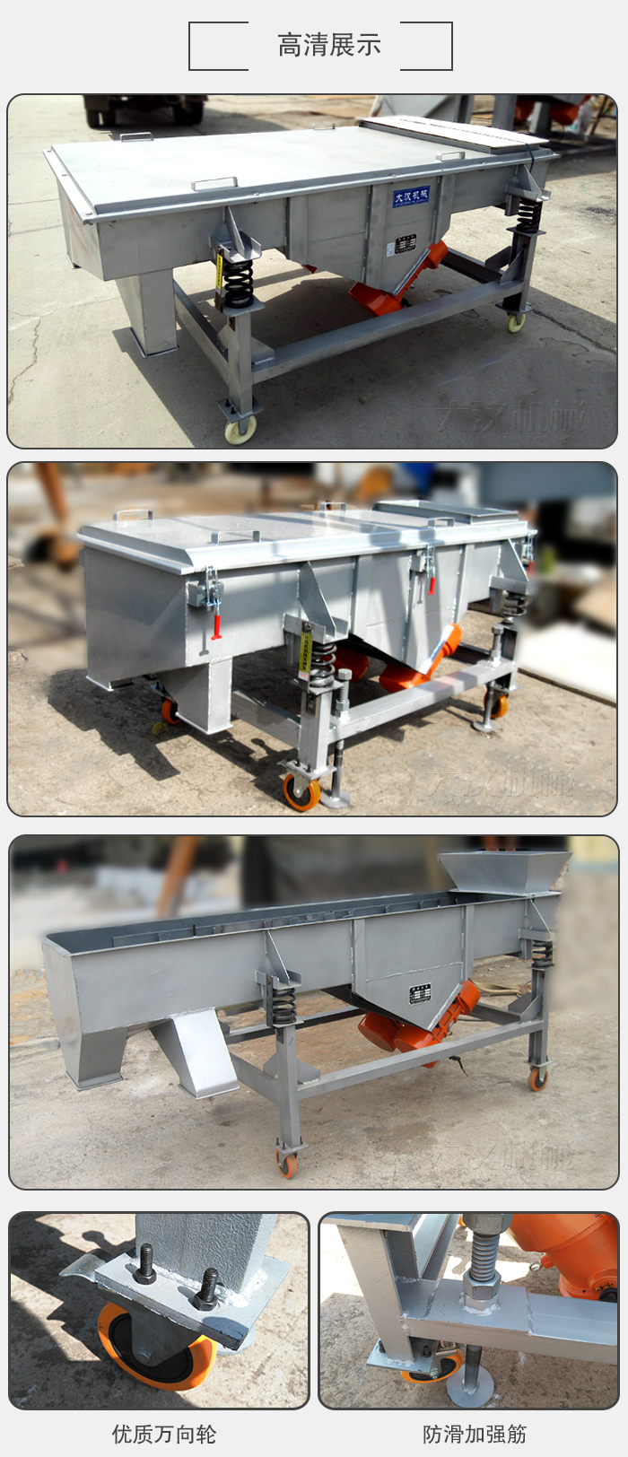 產(chǎn)品摘要:可移動(dòng)直線篩又叫做可移動(dòng)式直線篩,支腿加萬向輪及支架,可自由移動(dòng)可隨意升降,方便客戶根據(jù)現(xiàn)場(chǎng)需要隨時(shí)調(diào)節(jié)。